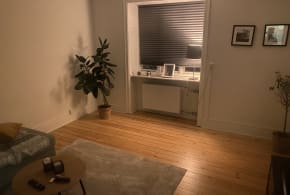 Own entrance with access to bathroom and kitchen via a tiny hall. There are 3 sets of windows with a view towards Nansensgade - and to the Lakes (in the winter). Some noise can appear from the street Gyldensløvesgade. But the appartment is on 3d floor and away from the street. Partly furnished (a couch, form of bookcase, a lamp).