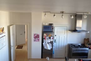 The apartment is 128m^2 with a large kitchen dining room, large bathroom with bath/shower/toilet and double sink, 4 double bedrooms approximately 16m^2 one of which appears in the photos. (many of the pictures are panoramic so give them a click to see the whole thing)