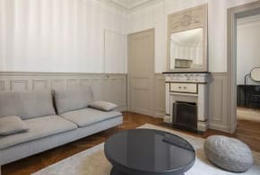 Det andet soveværelse har en stor dobbeltseng, en dekorativ pejs, et rummeligt klædeskab og store vinduer med fredelig udsigt over gårdhaven. Kvarteret er fyldt med caféer, restauranter og butikker, hvilket tilbyder en autentisk oplevelse.